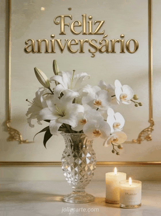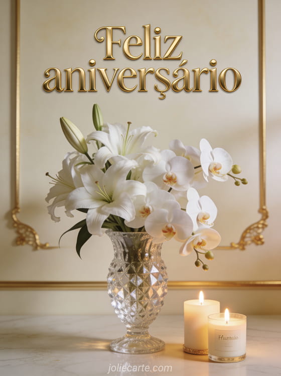 Compartilhe seus melhores votos de aniversário com um refinado arranjo de lírios brancos e orquídeas num vaso de cristal. Descubra também feliz aniversário flores ou feliz aniversário gifs.