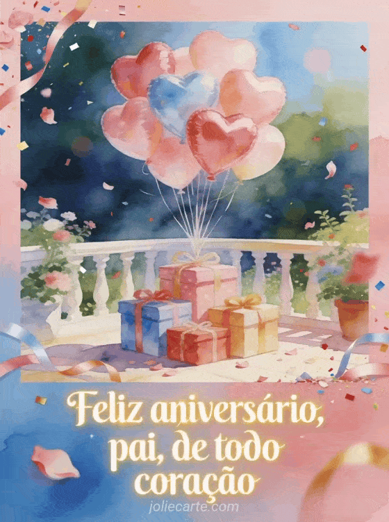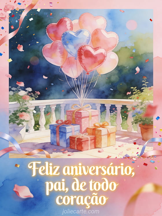Compartilhe feliz aniversário pai coração com um buquê de balões em forma de coração subindo acima de presentes embrulhados em um terraço iluminado de jardim. Você também pode enviar feliz aniversário pai carro, feliz aniversário pai caligrafia ou eu te amo feliz aniversário pai.