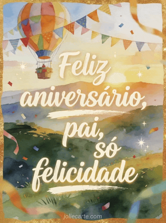 Compartilhe feliz aniversário pai em estilo gif com um balão de ar quente levando bandeirinhas brilhantes de aniversário acima de colinas ao nascer do sol. Você também pode enviar pais feliz aniversário pai texto emocionante, feliz aniversário pai texto ou feliz aniversário pai simples.