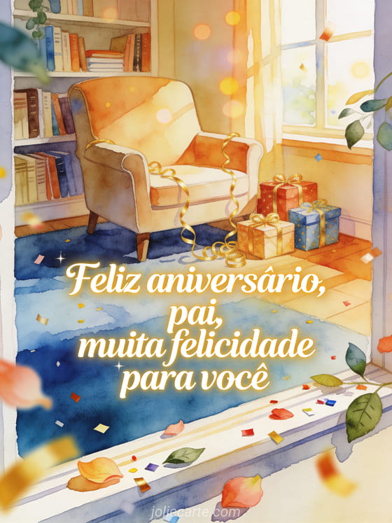 Compartilhe um texto de feliz aniversário pai com uma poltrona aconchegante, presentes embrulhados e serpentinas douradas em um canto de leitura iluminado. Você também pode enviar feliz aniversário pai simples, feliz aniversário pai coração ou feliz aniversário pai carro.