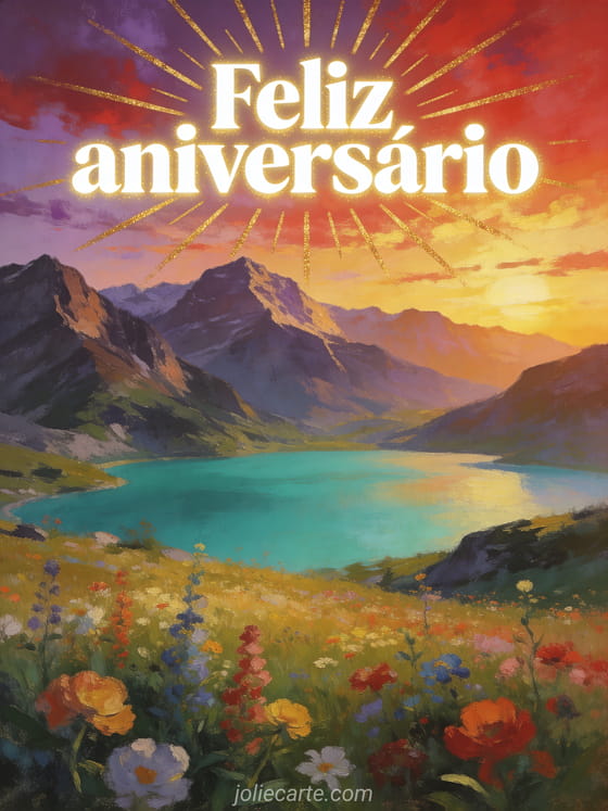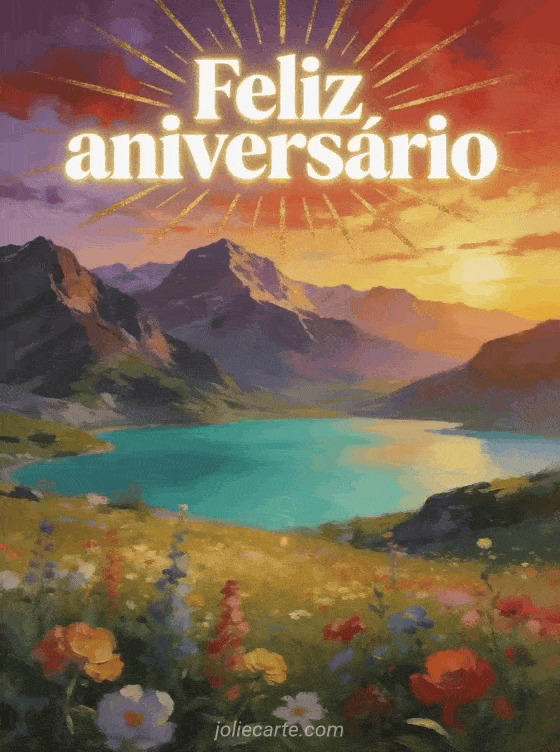 Envie um impressionante feliz aniversário com um espetacular paisagem de montanha e lago. Letras brancas luminosas com raios dourados brilham sobre um céu de pôr do sol espetacular. Descubra também um gif feliz aniversário fofo ou um feliz aniversário buquê de mimosa.