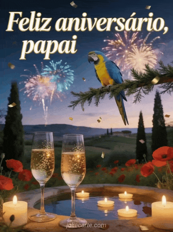 Envie um cartão de feliz aniversário papai com letras elegantes brancas e douradas, colinas da Toscana com papoulas e ciprestes, fogos de artifício, uma arara, velas flutuantes e taças de champanhe. Veja também uma carta de aniversário para seu pai, um feliz aniversário padrasto cartão ou pai eu te desejo um feliz aniversário.