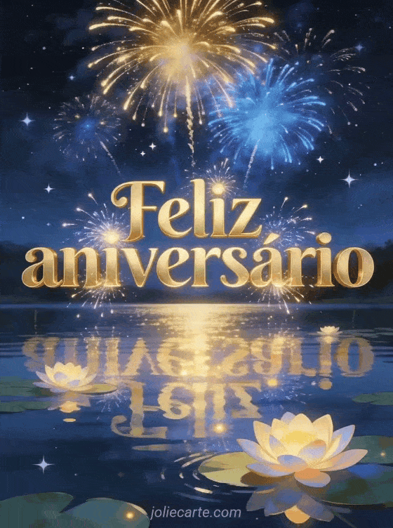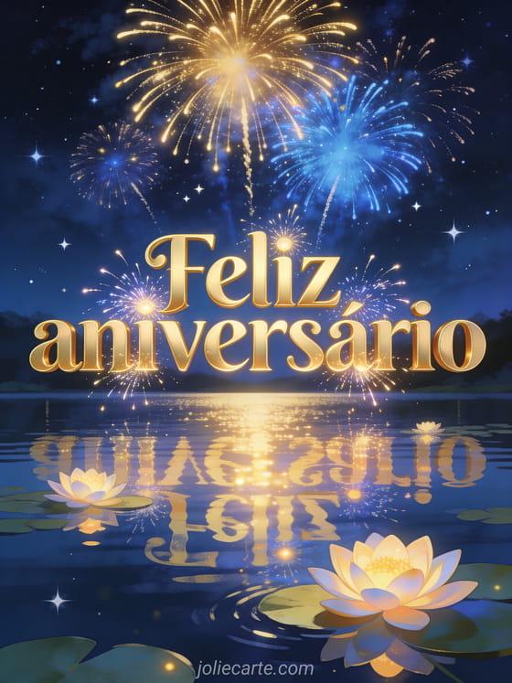 Envie um cartão feliz aniversário papai com letras douradas majestosas, fogos de artifício sobre um lago noturno estrelado, reflexos brilhantes e nenúfares luminosos. Veja também um texto de aniversário para seu papai, um engraçado feliz aniversário papai divertido ou um desenho de criança aniversário papai.