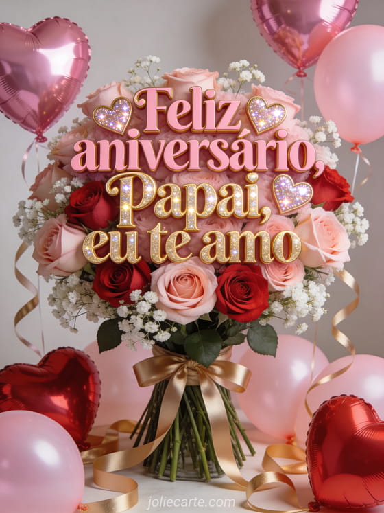 Envie um cartão carinhoso de feliz aniversário papai eu te amo, cheio de detalhes rosas e dourados, rosas, corações brilhantes e clima festivo. Veja também um feliz aniversário pai desenho, um texto de aniversário para pai ou um gif feliz aniversário papai.