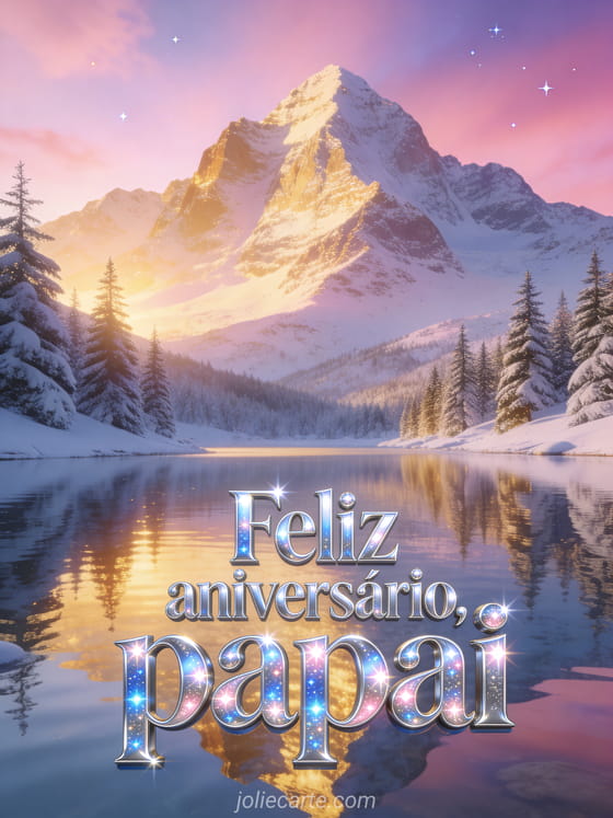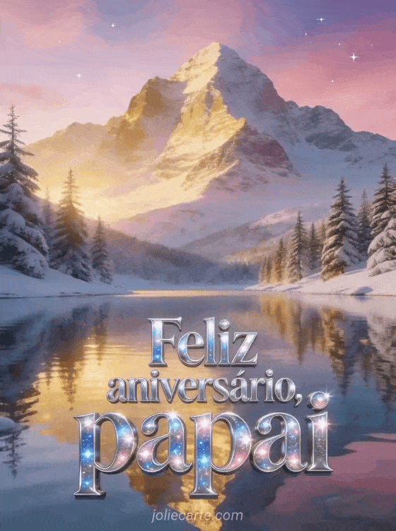 Envie um feliz aniversário papai gif tranquilo com letras prateadas brilhantes, amanhecer na montanha, lago espelhado, reflexos dourados na água e pinheiros nevados. Veja também um feliz aniversário papai cartão virtual, um feliz aniversário papai cartão ou um texto de aniversário para seu papai.