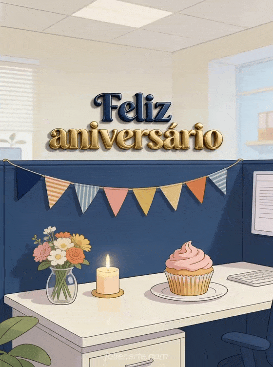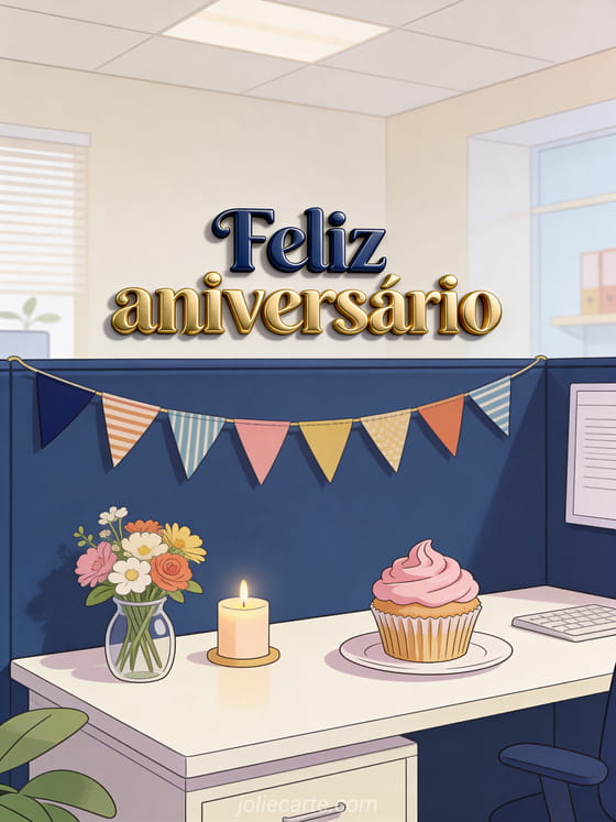 Celebre sua colega de trabalho com um cartão de aniversário acolhedor de escritório, com guirlanda, flores frescas e um cupcake com vela. Você também pode enviar um feliz aniversário colega de trabalho ou um feliz aniversário chefe.