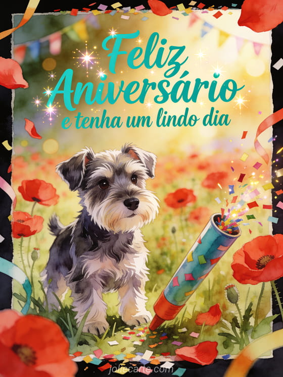 Celebre sua neta com um cartão luminoso em aquarela mostrando um filhote de schnauzer miniatura ao lado de um canhão de confetes em um campo de papoulas vermelhas. Veja também um feliz aniversário para minha neta, um aniversário para minha neta ou uma feliz aniversário neta imagem.