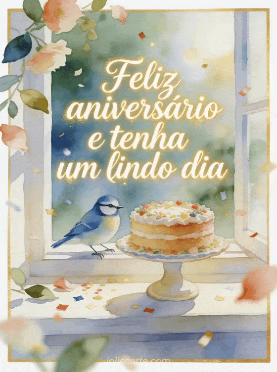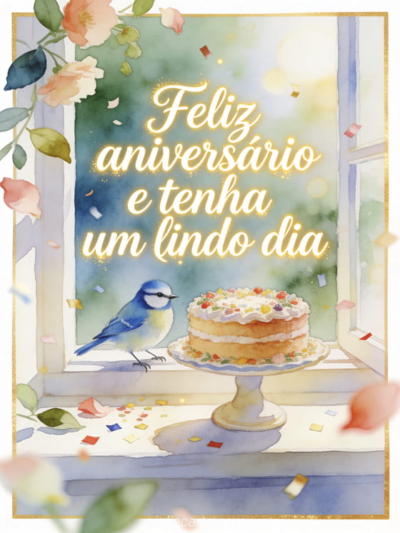Envie um cartão feliz aniversário para papai com caligrafia creme elegante, um chapim-azul pousado ao lado de um suporte de bolo decorado em uma janela luminosa, pétalas, folhas e confete sobre a borda. Veja também feliz aniversário meu papai, feliz aniversário papai amor ou um poema feliz aniversário sogro.
