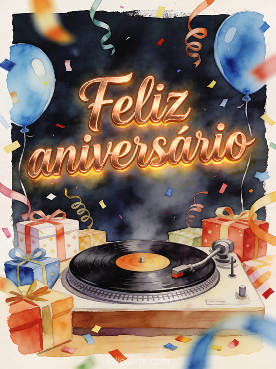 Envie uma mensagem retrô e calorosa de aniversário para seu irmão mais velho com um disco de vinil girando, presentes embrulhados, balões azuis e serpentinas enroladas. Veja também feliz aniversário irmãozinho, feliz aniversário meu irmão gif ou irmãozinho feliz aniversário meu irmão gif.