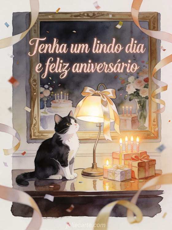 Envie uma mensagem elegante de aniversário com um gato preto e branco em aquarela, uma luminária de mesa acesa, fitas de cetim, presentes e velas de aniversário. Você também pode compartilhar um mensagem de aniversário colega de trabalho, um feliz aniversário de uma colega de trabalho ou um feliz aniversário meu colega de trabalho.