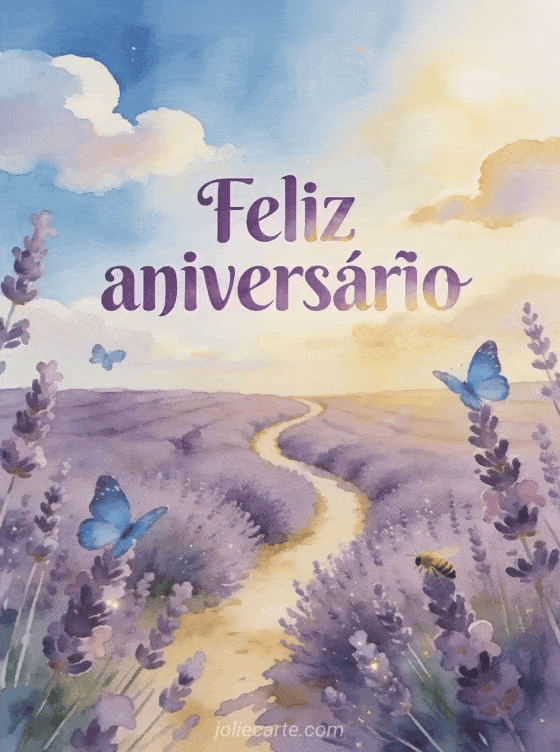 Compartilhe uma mensagem serena de aniversário com letras violetas luminosas em aquarela, um campo de lavanda sob céu azul, nuvens suaves, um caminho sinuoso, borboletas azuis, abelhas e luz dourada do pôr do sol. Você também pode enviar um feliz aniversário para uma mãe maravilhosa, um feliz aniversário mamãe animado ou um feliz aniversário mamãe cartão.