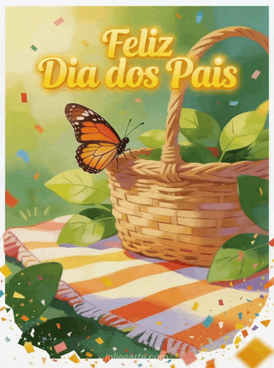 Envie um cartão feliz dia ao pai com letras amarelo-girassol, uma ilustração acrílica viva de uma borboleta monarca sobre uma cesta de piquenique trançada, folhas verdes, toalha listrada e confete brilhante. Veja também um cartão para dia dos pais, um poema de Dia dos Pais meu coração me diz ou cartões de Dia dos Pais.