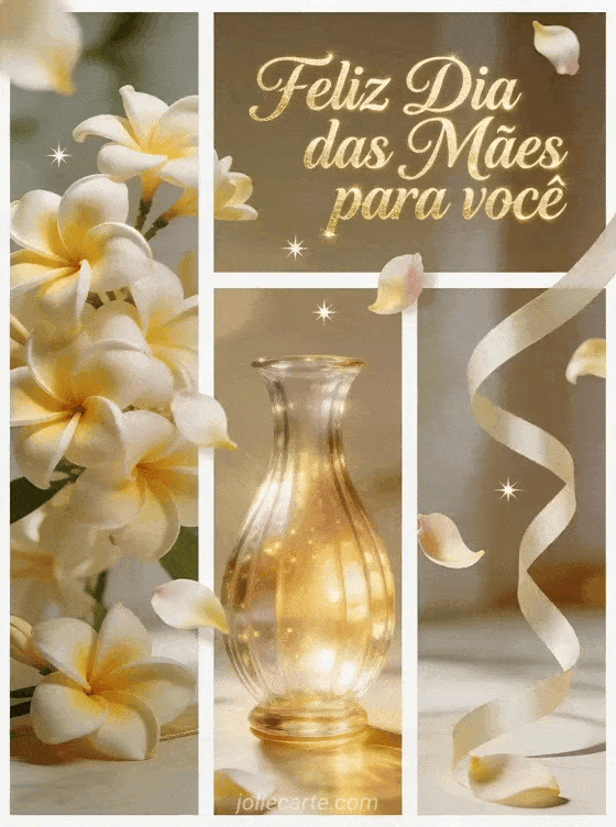 Compartilhe um feliz Dia das Mães cartão em um design polido de três painéis com flores cremosas de frangipani, vaso de vidro luminoso, fitas suaves, pétalas e pequenas estrelas. Veja também fotografias do Dia das Mães, mensagens para o Dia das Mães ou poesia Dia das Mães beijos.
