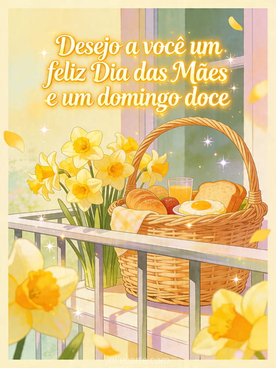Compartilhe uma mensagem luminosa para o Dia das Mães e um domingo doce, com uma cesta de café da manhã, narcisos radiantes e uma varanda de primavera. Veja também feliz Dia das Mães mãe falecida, uma citação para o Dia das Mães ou citações para o Dia das Mães.