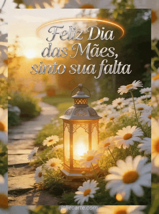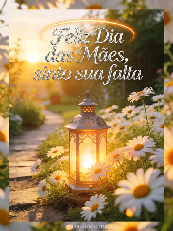 Compartilhe feliz Dia das Mães mãe falecida com caligrafia prateada, halo acolhedor e uma lanterna luminosa fotorrealista cercada por margaridas em um caminho de jardim ao amanhecer. Este cartão relaxante diz sinto sua falta com ternura. Veja também citação para o Dia das Mães, citações para o Dia das Mães ou cartão para o Dia das Mães.