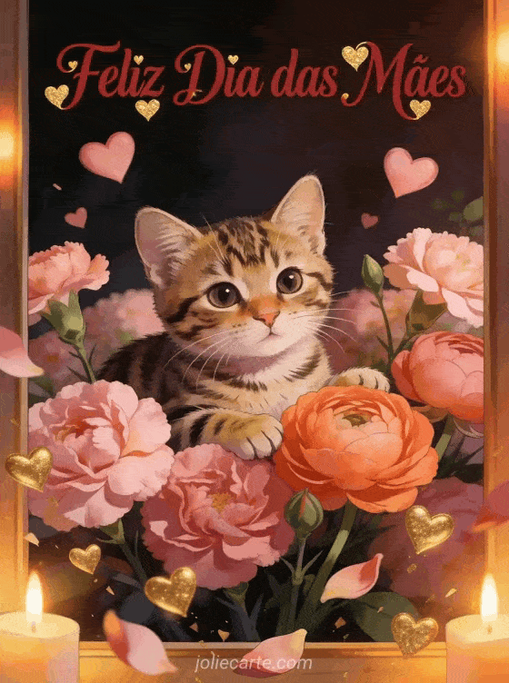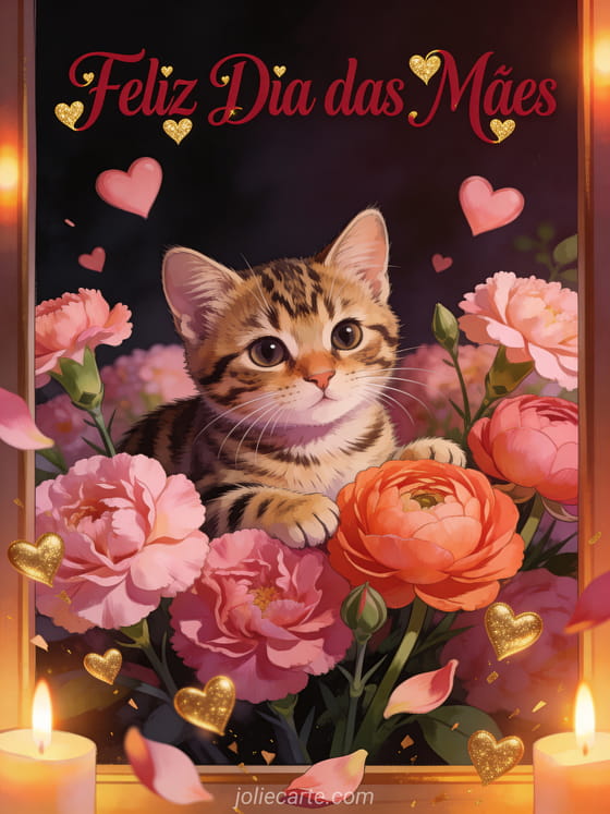 Expresse seu amor com este cartão de feliz dia das mães meu amor. Um gatinho bengal entre ranúnculos cor-de-rosa e coral com corações dourados flutuantes. Descubra também um modelo de cartão para dia das mães ou um cartão dia das mães.