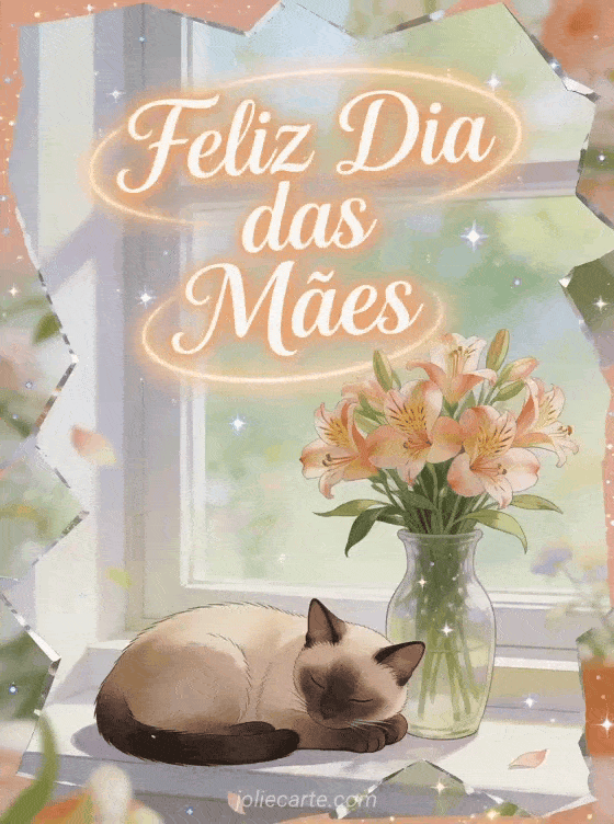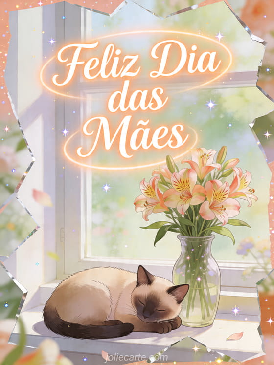 Compartilhe um cartão acolhedor de Dia das Mães com um gato siamês enrolado, alstroemérias frescas e uma janela luminosa cheia de luz suave de primavera. Veja também texto sobre o Dia das Mães, mensagens do Dia das Mães ou fotografia para o Dia das Mães.