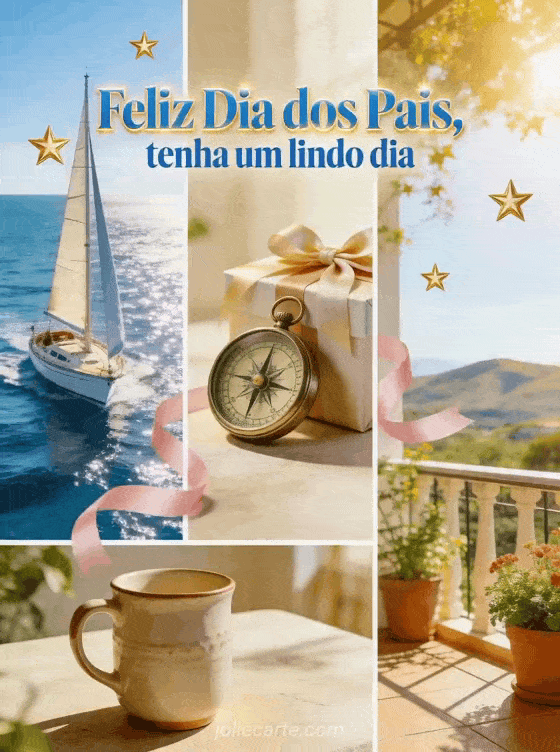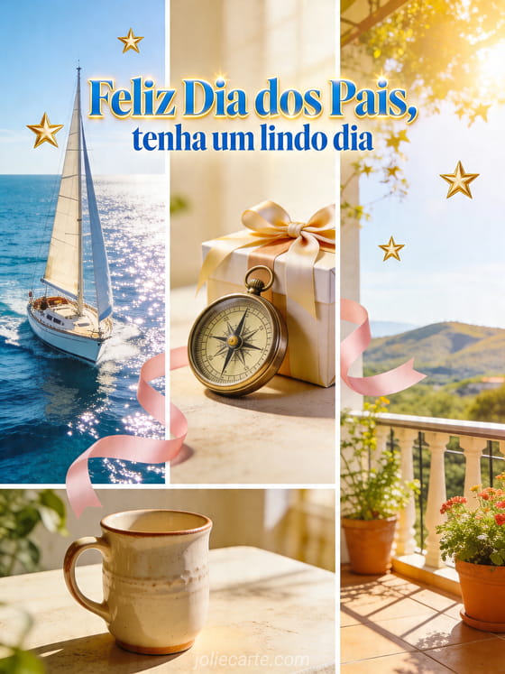 Deseje ao papai um lindo dia com uma colagem realista de Dia dos Pais, trazendo um veleiro em água brilhante, uma bússola ao lado de um presente com fita e um terraço ensolarado com xícara. Este design leve e alegre é cheio de clima festivo. Veja também cartão personalizado Dia dos Pais, modelo de cartão Dia dos Pais ou cartão fácil de Dia dos Pais.