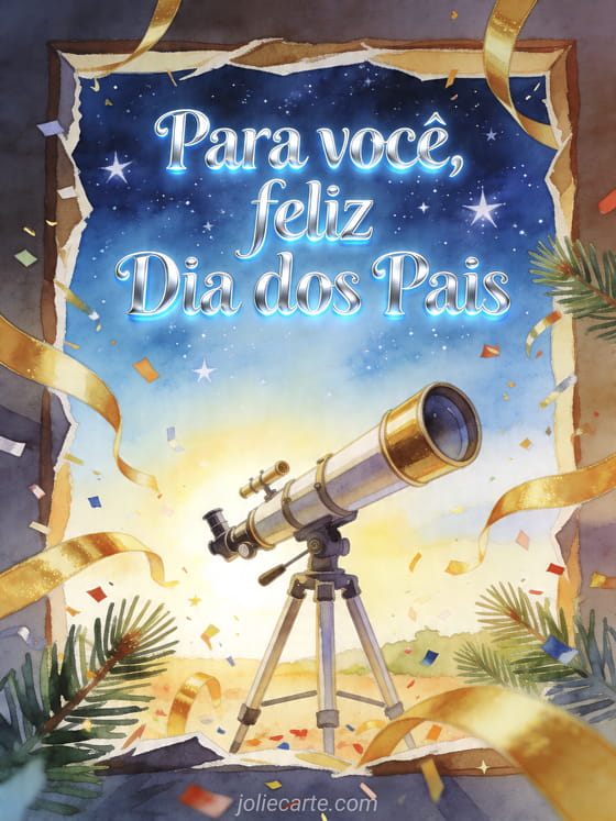 Envie feliz dia dos pais ao meu filho com letras prateadas luminosas, uma ilustração em guache de um pequeno telescópio sob um céu estrelado de verão, ramos de pinheiro, serpentinas douradas e confete festivo. Veja também uma imagem grátis Dia dos Pais, um cartão bonito de Dia dos Pais ou feliz dia dos pais para todos os papais.