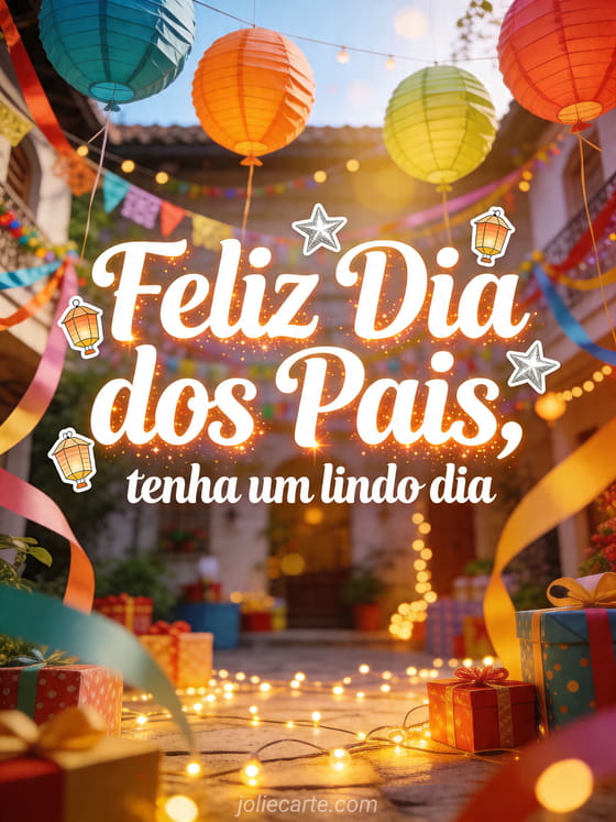 Deseje um belo Dia dos Pais com uma cena viva de pátio cheia de lanternas de papel coloridas, guirlandas de fitas, presentes e cordões de luz. Você também pode enviar um poema de Dia dos Pais beijos, cartões do Dia dos Pais ou feliz dia dos pais para meu filho e todos os papais.
