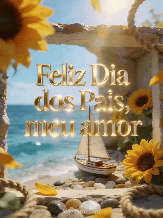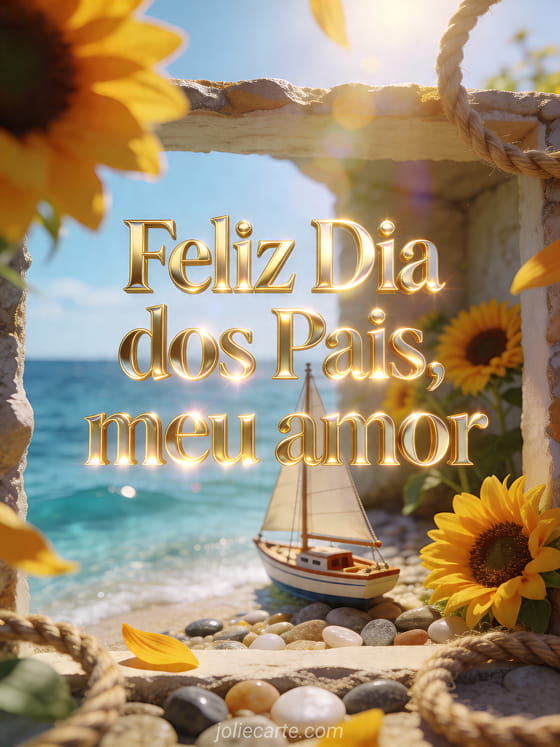 Envie uma saudação carinhosa de feliz Dia dos Pais meu amor com um veleiro em miniatura em uma enseada ensolarada, girassóis frescos, seixos polidos e cores vivas do mar. Veja também um modelo de cartão do Dia dos Pais, feliz dia dos pais minha vida ou palavras carinhosas de Dia dos Pais.
