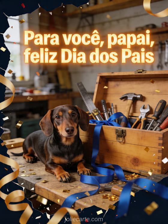 Envie uma imagem calorosa de feliz Dia dos Pais papai com um cão bassê fotorrealista ao lado de uma caixa de ferramentas aberta com ferramentas polidas, fitas azuis, confete dourado e uma cena luminosa de oficina. Veja também palavras doces para dia dos pais, feliz Dia dos Pais meu filho ou amor Dia dos Pais texto amor.