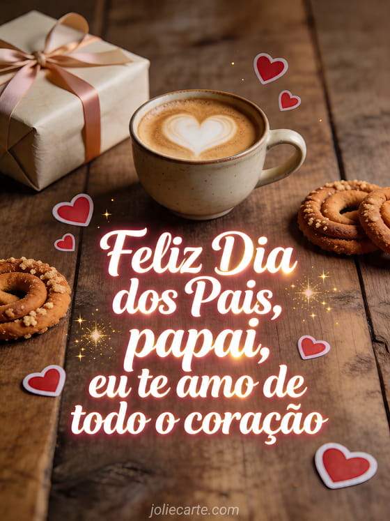 Diga ao papai quanto você o ama com um cartão aconchegante com café, latte art em forma de coração, presente embrulhado e biscoitos de canela. Você também pode enviar feliz Dia dos Pais, uma feliz Dia dos Pais papai imagem grátis ou flores dia dos pais.