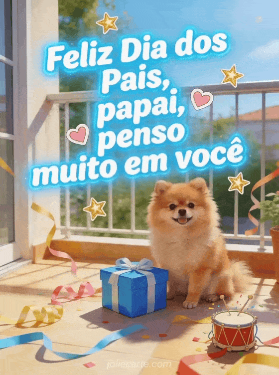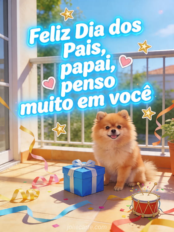 Envie um texto terno de feliz Dia dos Pais para o papai com letras arredondadas brilhantes, pequenos corações, estrelas douradas, um cachorro pomerânia ao lado de uma caixa de presente azul, serpentinas e um pequeno tambor de festa em uma varanda ensolarada. Você também pode descobrir feliz dia das mães mamãe e feliz dia dos pais papai, um cartão grátis feliz dia dos pais ou um cartão para Dia dos Pais.