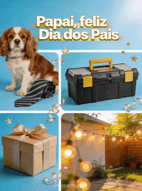 Celebre o papai com um cartão realista e alegre em formato de colagem, com um cachorro Cavalier King Charles ao lado de uma gravata, uma caixa de ferramentas, um presente e um canto de jardim com luzes quentes. Um detalhe próximo para o Dia dos Pais. Veja também cartão original de Dia dos Pais, cartões Dia dos Pais ou feliz Dia dos Pais papai texto.
