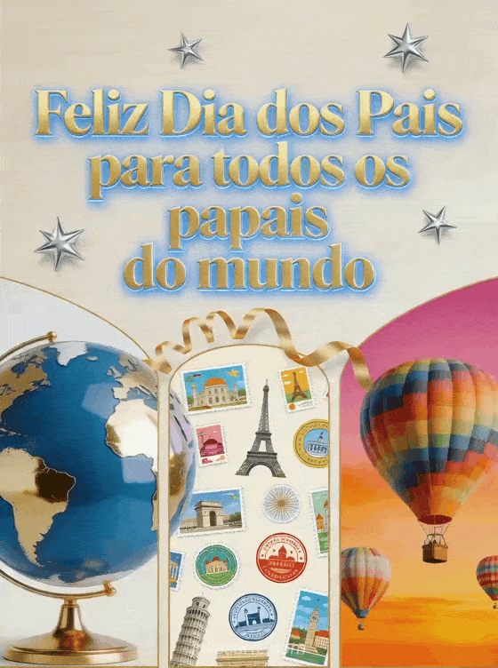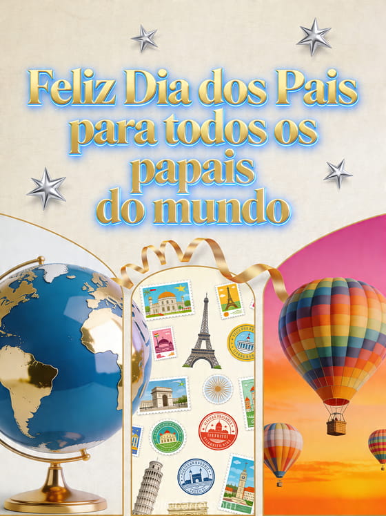 Celebre todos os papais do mundo com uma colagem ilustrada alegre que mostra um globo polido, adesivos de viagem coloridos e balões de ar quente sobre um horizonte luminoso. Veja também uma imagem de feliz Dia dos Pais papai, amor poema de amor para Dia dos Pais ou feliz dia do pai.