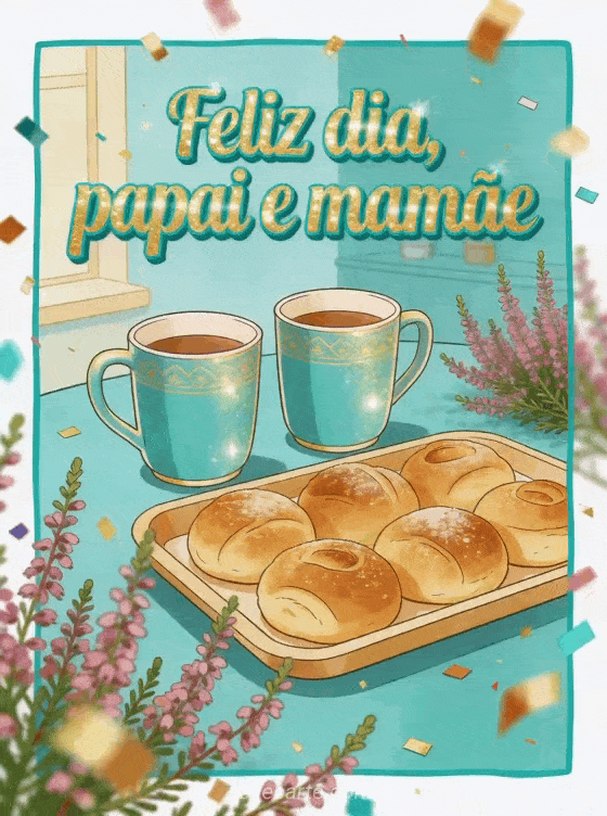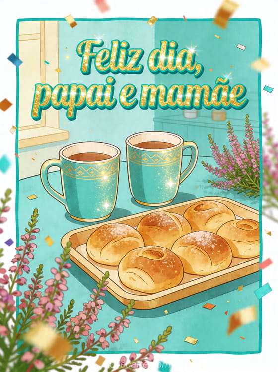 Compartilhe um cartão ilustrado e aconchegante para papai e mamãe com duas xícaras combinando, uma bandeja de brioches e ramos de urze que ultrapassam a borda da imagem. Este design equilibrado e carinhoso é perfeito para celebrar os dois. Veja também feliz dia dos pais ao meu filho, imagem grátis Dia dos Pais ou cartão bonito de Dia dos Pais.