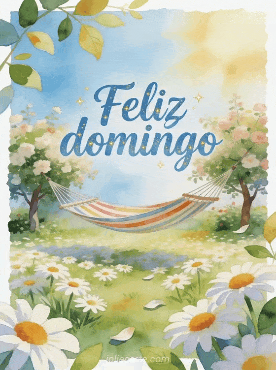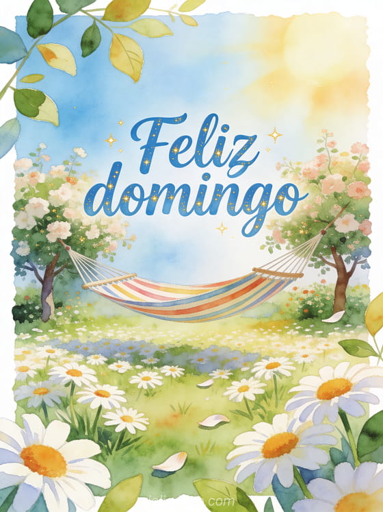 Envie uma saudação tranquila de feliz domingo com letras azul-céu, brilhos dourados, uma rede listrada entre árvores floridas do jardim e um tapete de margaridas ao sol. Você também pode compartilhar bom dia feliz domingo imagens, feliz domingo imagens com flores ou mensagem para dizer bom domingo.