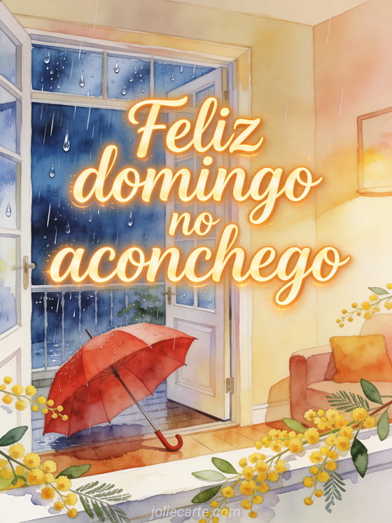 Compartilhe uma mensagem aconchegante de domingo com letra âmbar, uma vista quente da janela com chuva lá fora, um guarda-chuva vermelho junto à porta e ramos de mimosa cruzando a borda. Você também pode enviar um feliz domingo beijos gif animado, mensagens de feliz domingo ou uma café feliz domingo amizade imagem.