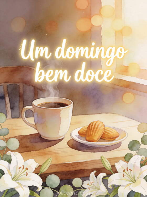 Compartilhe um cartão suave de feliz domingo com uma xícara de café fumegante, madeleines e lírios sobre uma mesa de madeira. Veja também feliz domingo gatinho gif, feliz domingo cartão grátis ou imagens de feliz domingo.