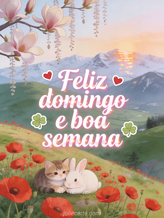 Envie um cartão terno de feliz domingo e boa semana com letras brancas cursivas, trevos, pequenos corações vermelhos, papoulas vermelhas em uma colina sobre um vale verde, um gatinho e um coelho aconchegados, magnólias floridas e montanhas nevadas ao pôr do sol. Veja também bom domingo descanso imagem, bom domingo citação ou bom domingo amizade gif.