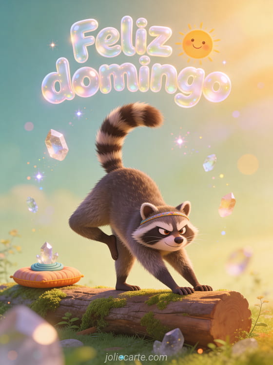 Envie uma saudação engraçada de feliz domingo com letras bolha saltitantes e um guaxinim fazendo poses de yoga em um tronco em uma cena absurda de bem-estar. Veja também desejar um feliz domingo, bom domingo de junho ou bom domingo amizade imagens.