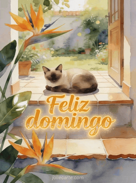 Compartilhe um feliz domingo com um gato siamês aconchegado em um degrau de jardim, cercado por aves do paraíso e luz quente de aquarela. Envie este carinho e descubra também feliz domingo cartão grátis, imagens de feliz domingo ou imagem animada de bom domingo.