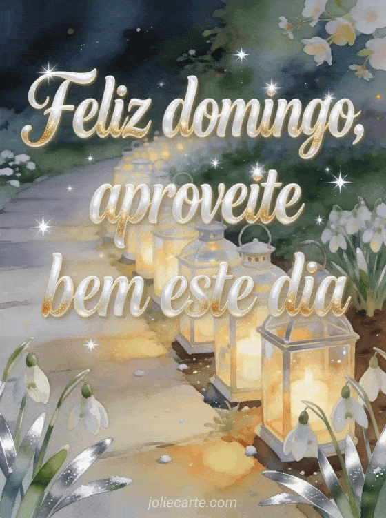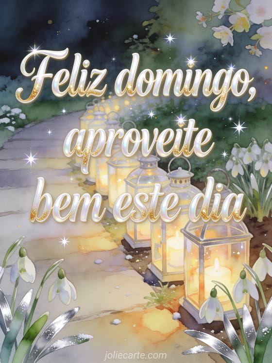 Deseje feliz domingo e que você aproveite bem este dia com lanternas de vidro acesas junto a um caminho de jardim, flocos-de-neve e folhas verde-prateadas em luz dourada de aquarela. Compartilhe este cartão cintilante e descubra também feliz domingo cartões animados, beijos de domingo imagem ou feliz domingo cartão.
