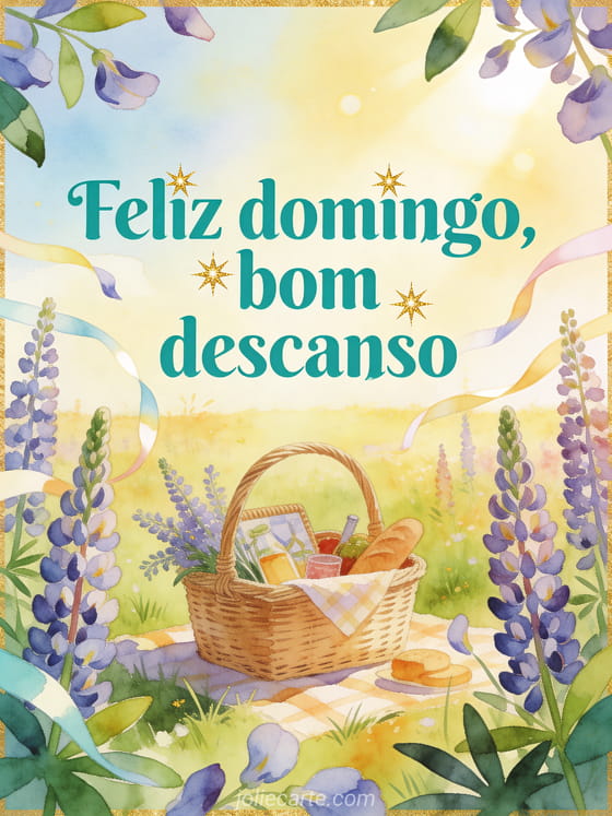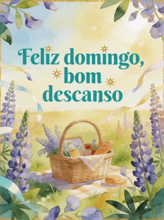 Compartilhe um feliz domingo de descanso com uma cesta de piquenique em uma campina ensolarada, tremoços altos, fitas de luz e um clima alegre de lazer. Você também pode compartilhar texto de feliz domingo, feliz domingo cachorros imagem ou feliz domingo cartão virtual animado.