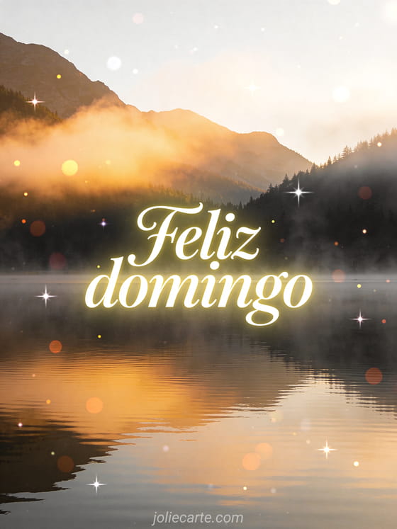 Compartilhe uma imagem de feliz domingo com um lago sereno ao nascer do sol, neblina suave subindo e montanhas refletidas na água. Envie mais calma de domingo com bom domingo cartão, feliz domingo e boa semana mensagem ou bom domingo descanso imagem.