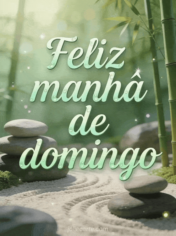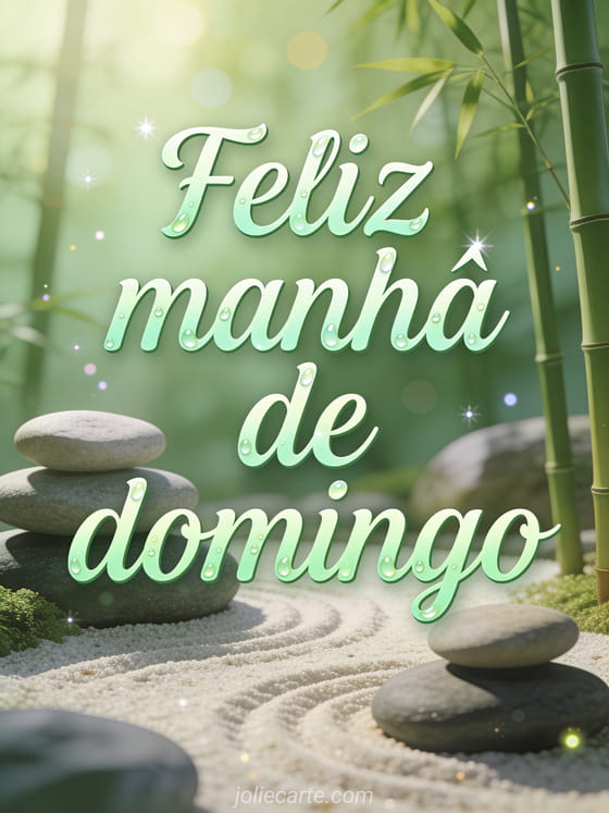 Envie uma saudação tranquila de feliz manhã de domingo com letras verde-menta, efeito de gotas de orvalho e um jardim zen sereno com pedras lisas e bambu. Veja também bom domingo meu amor, bom fim de domingo ou bom dia domingo.