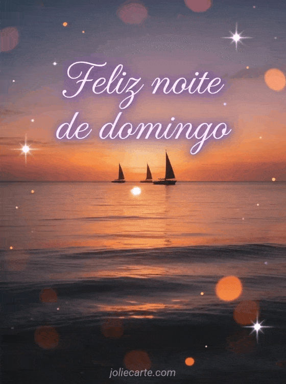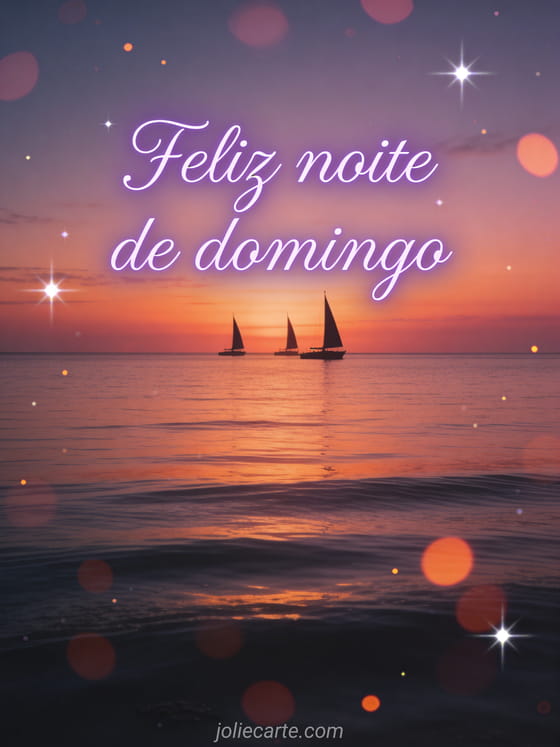Envie uma saudação suave de feliz noite de domingo com letras roxas, um pôr do sol tranquilo sobre o mar calmo e silhuetas de veleiros. Veja também bom domingo amizade, bom domingo no Senhor ou feliz domingo gif animado brilhante.