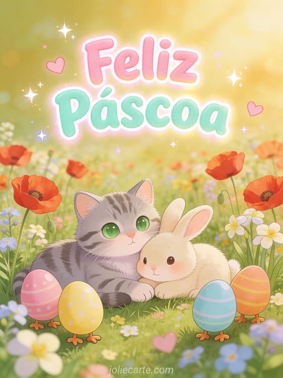 Encante os pequenos com este adorável cartão de Feliz Páscoa com um gatinho rajado e um coelhinho abraçados num campo de papoulas e margaridas, cercados por ovos de Páscoa coloridos. Uma ilustração kawaii cheia de alegria e ternura. Descubra também um cartão de animais de Páscoa ou um cartão com vídeo do coelhinho de Páscoa.