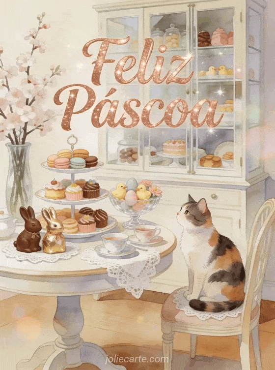 Compartilhe este alegre gif animado de Páscoa com um adorável gato calico, ovos de Páscoa e cerejeira em flor. Descubra também imagem feliz Páscoa grátis ou gif de Páscoa grátis.