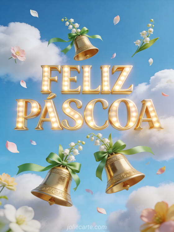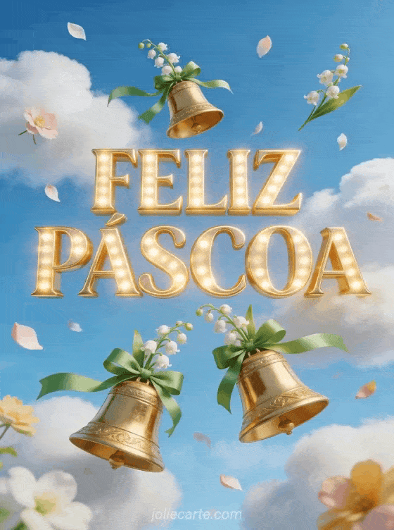 Celebre a Páscoa com este gif alegre: três sinos dourados ornados com fitas verdes e lírios-do-vale voando num céu azul com pétalas de flores e nuvens felpudas. Descubra também um Feliz Páscoa desejos ou um lindos cartões de Páscoa.