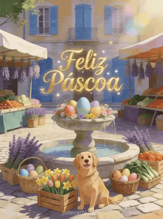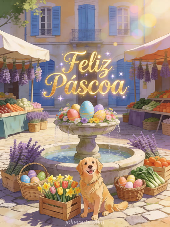 Feliz Páscoa imagens uma praça provençal ensolarada com ovos de Páscoa e um golden retriever