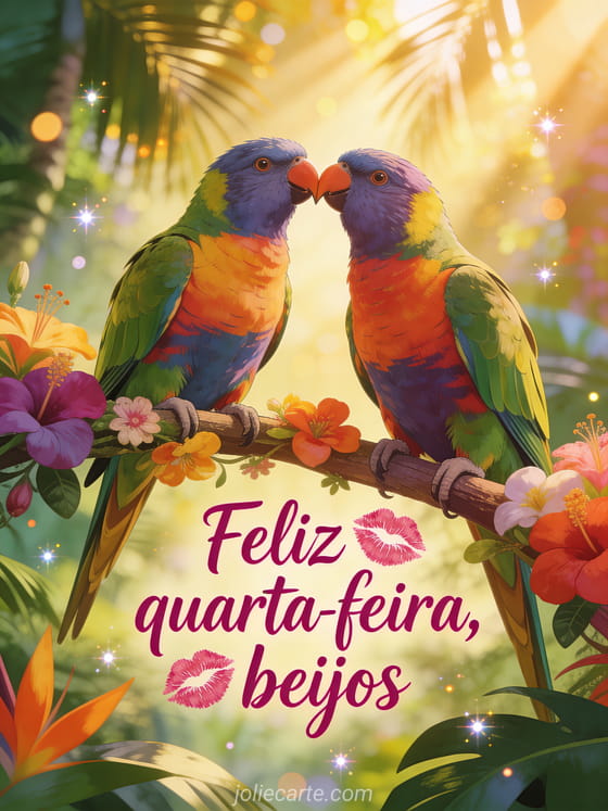 Envie beijos carinhosos de feliz quarta-feira com dois papagaios coloridos tocando os bicos em um galho tropical, cercados por flores exóticas e luz dourada. Veja também um feliz quarta-feira gif de gato, uma feliz quarta-feira humor imagem engraçada ou um feliz quarta-feira cartão animado.
