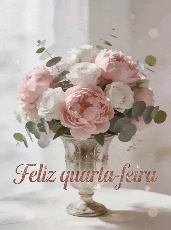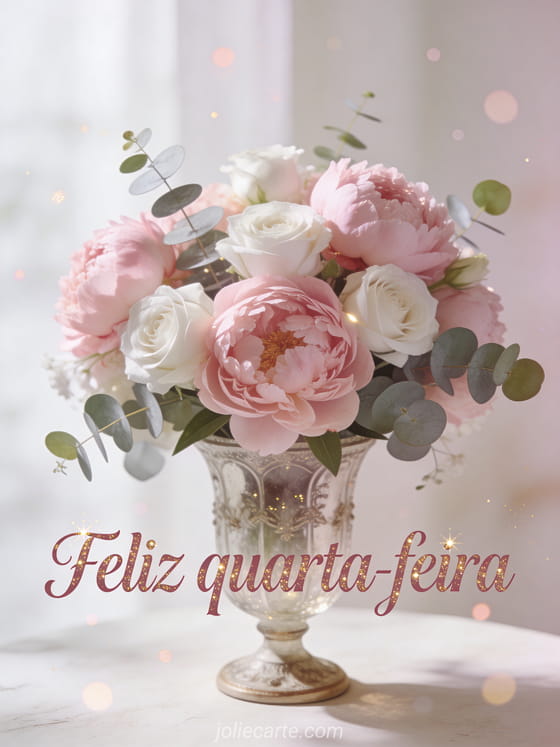 Envie um buquê romântico de feliz quarta-feira com peônias rosadas, rosas brancas e eucalipto em um vaso de vidro vintage. Veja também feliz quarta-feira beijos gif animado, feliz quarta-feira gif de gato ou feliz quarta-feira humor imagem engraçada.