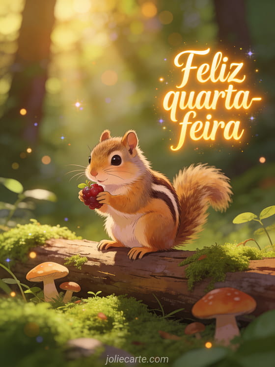 Envie uma saudação adorável de feliz quarta-feira com um esquilo peludo segurando uma berry em um tronco com musgo, cercado por cogumelos e luz filtrada da floresta. Veja também imagem animada feliz quarta-feira, bom dia tenha um bom dia bom dia de quarta-feira ou oi feliz quarta-feira humor.