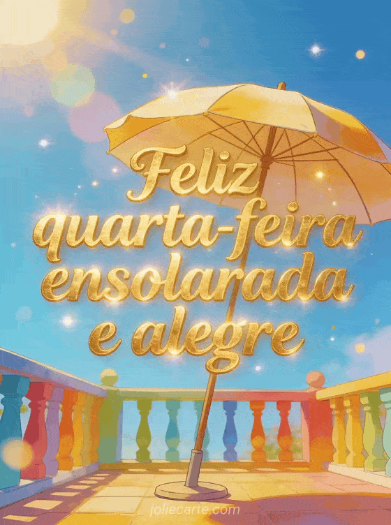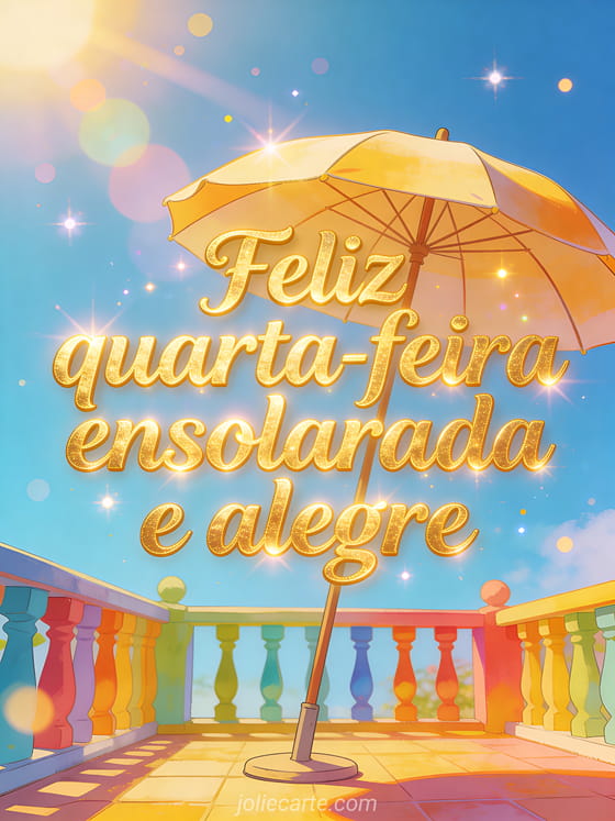 Deseje uma feliz quarta-feira ensolarada e alegre com letras douradas, brilho radiante, um guarda-sol aberto em um terraço colorido, reflexo de lente, bokeh brilhante e clima positivo. Veja também cartão boa quarta-feira beijos, texto para desejar uma feliz quarta-feira ou feliz quarta-feira com animais.